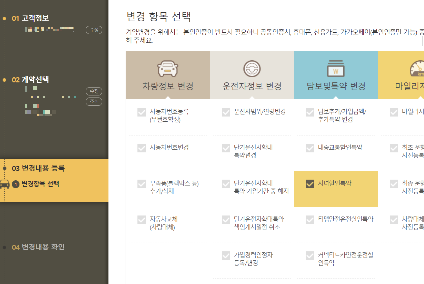 * 계약변경 - 자동차보험 계약변경 - 개인정보 인증 - 자녀할인 특약